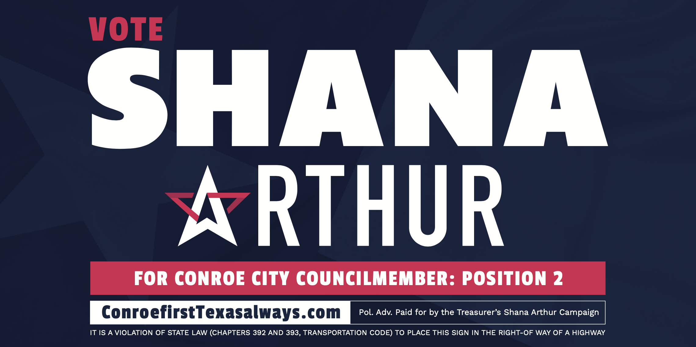 We partnered with Shana Arthur for Conroe City Council to create a complete campaign identity across digital and physical touchpoints. From branding and website to shirts, print, and signage, every piece was designed to present a cohesive, professional, and approachable campaign presence.